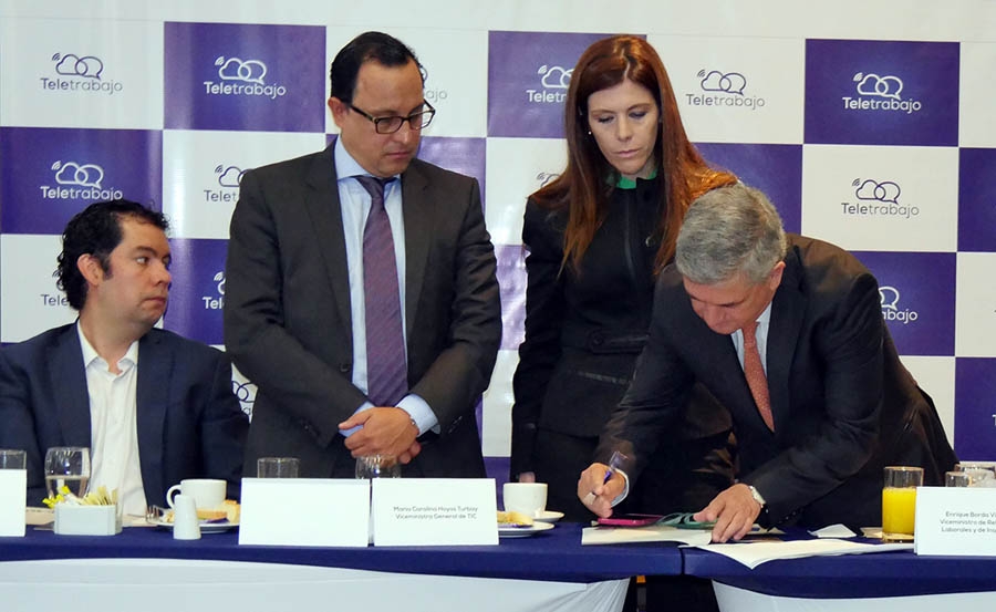 “Es evidente que cuando los trabajadores no tienen que trasladarse en servicio público o privado, esto mejora la calidad del aire en las ciudades y la sostenibilidad ambiental que es un elemento fundamental para los habitantes, por ejemplo en una ciudad como Bogotá”, explicó el viceministro de Relaciones Laborales e Inspección, Enrique Borda Villegas, quien participó en la firma del convenio junto con la viceministra de las TIC, María Carolina Hoyos; el director de la Fundación Chevrolet, Javier Uribe; y el gerente seccional Bogotá de la ANDI, Camilo Montes.